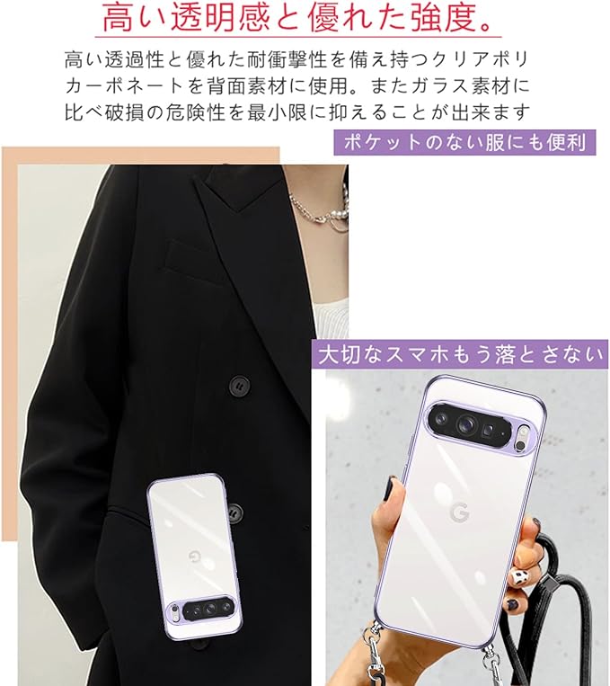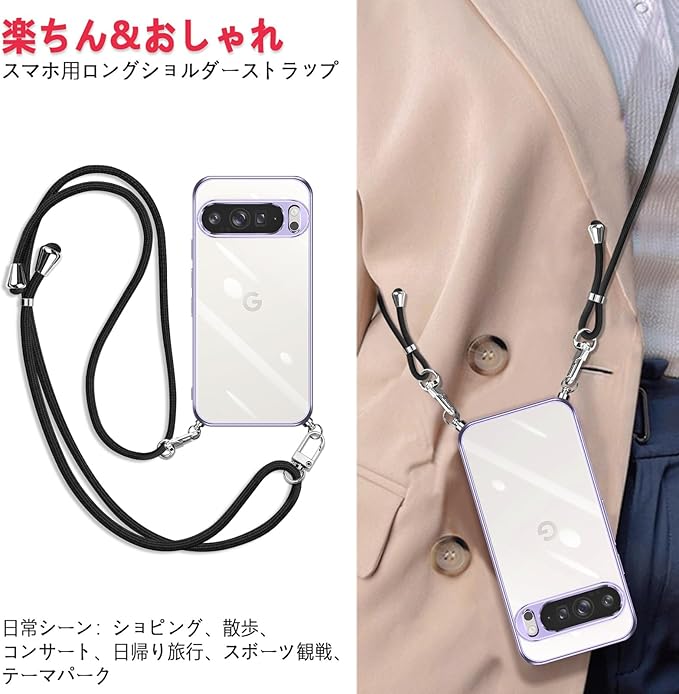 Google Pixel 10 Pro XL 用の ケース クリア ショルダー グーグル ピクセル10Pro xl スマホケース カバー 透明 TPU 薄型 肩掛け 首掛け 斜めかけケース 耐衝撃(ライトパープル)