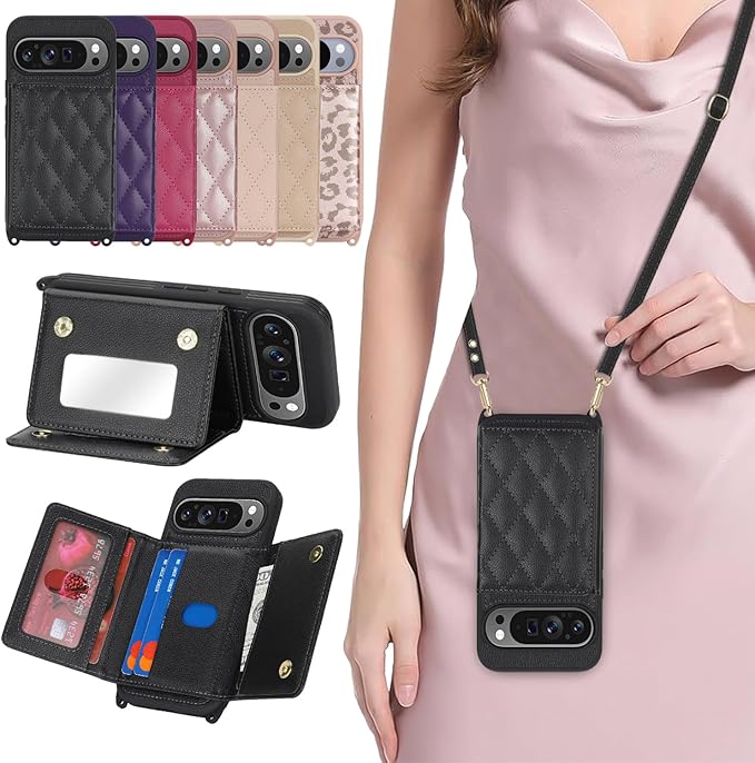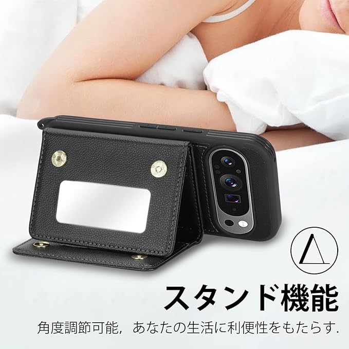 対応 Google Pixel 10 ケース ショルダー グーグルピクセル10 ケース カード収納 鏡 肩掛け 斜めかけ スマホショルダー ピクセル10 Pro ストラップ付き 耐衝撃 調節可能な 携帯ケース pixel 10 Pro - ブラック