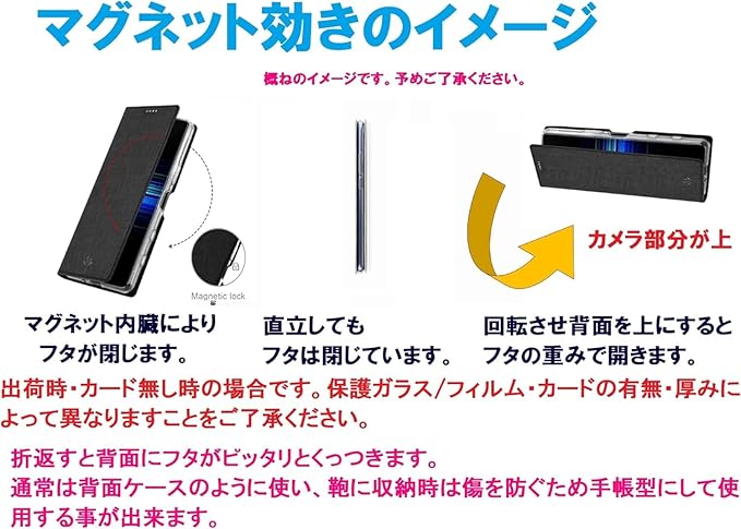 カード収納は1枚です。マグネットの効きが弱く、傾けると蓋が開く程度の磁力です。また、カード収納や機種本体に貼られた保護ガラスやフィルムにより状況は異なります。