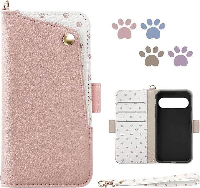 Google Pixel 10 ケース 手帳型 グーグル ピクセル 10 プロ ケース 可愛い 猫 足跡 ピクセル 9 Pro カバー 女性 マグネット式 Pixel9 スマホケース カード入れ収納 横置きスタンド機能 ぐーくるぴくせる10 PUレザー 衝撃吸収 軽量 全面保護 外側ポケット 防塵 擦り傷防止 シンプル 大人人気 6.3インチ (ピンク)