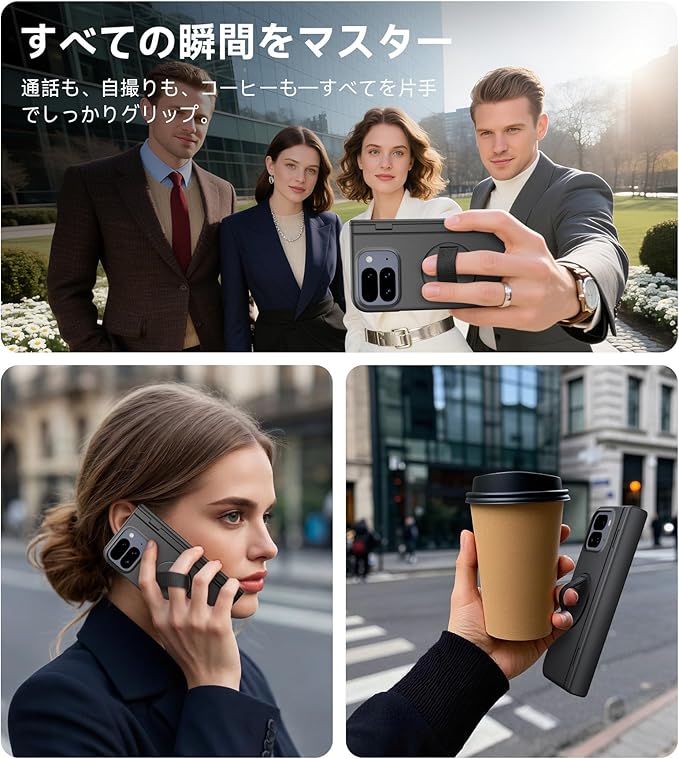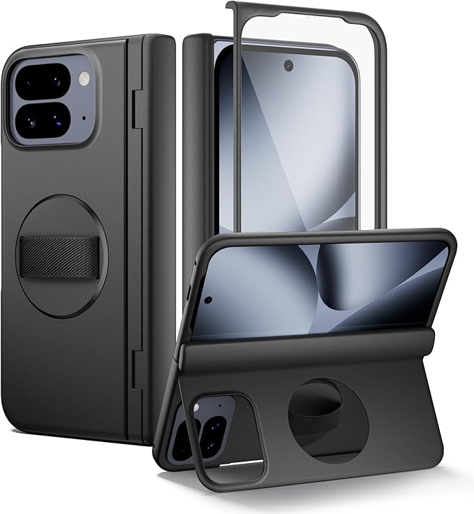 SURITCH 対応Google Pixel 10 Pro Fold ケース 360 回転式ハンドストラップ、グリップホルダー、キックスタンド、スクリーンプロテクター、ヒンジ保護機能付き、スリムで頑丈な耐衝撃保護カバー ブラック