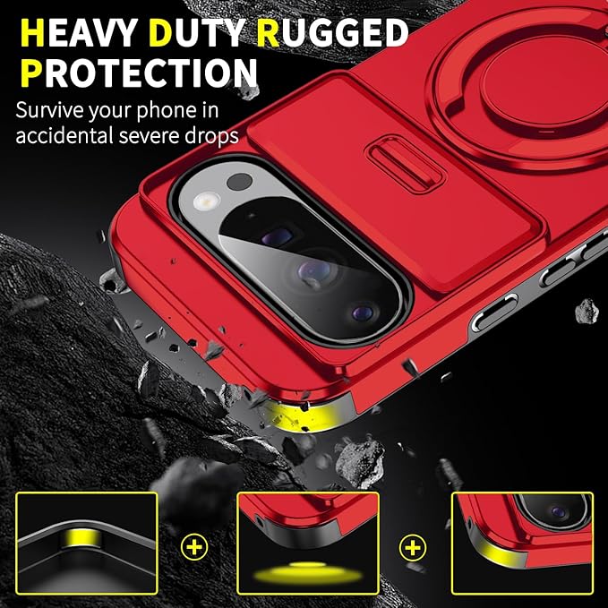Pixel10 Pro XL 対応 ケース 【横縦両立・多機能360度回転スタンド】 リング 耐衝撃 薄型 TPU+PC 車載ホルダー レンズ保護 フィット感 防指紋 おしゃれ ストラップホール付き 落下防止 防塵 グーグル ピクセル10 プロ XL 対応 カバー 6.8インチ レッド JMJP15-3