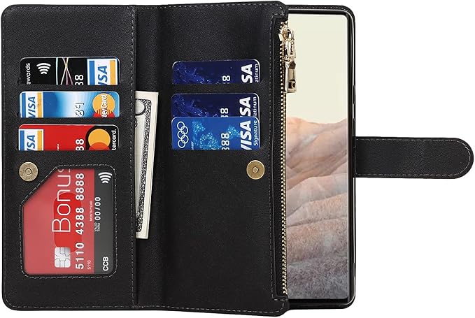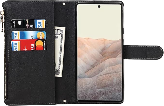 Eastwave for Google Pixel 6 Pro ケース for pixel 6pro 縄掛けケース 手帳型 財布型 ICカード コインポケット ストラップ付き カード 収納 小銭入れ ファスナーポケット付き PUレザー 6色ブラック