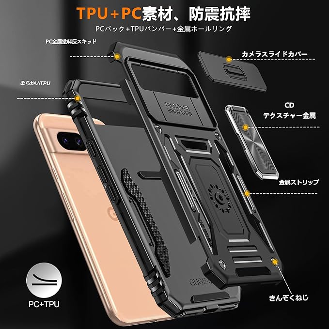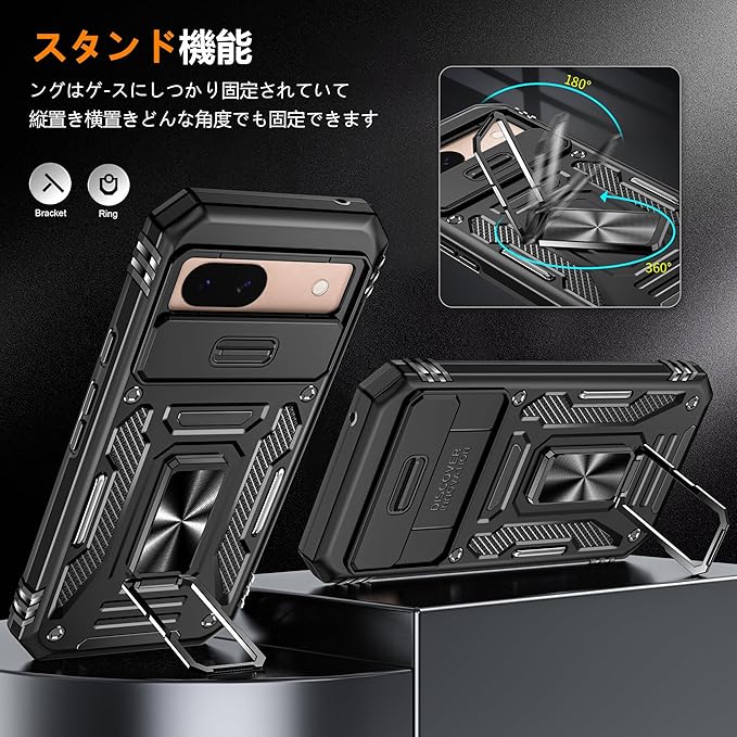 対応 Pixel 8A 用のケース リング付き スライド式カメラカバー 衝撃吸収 対応 ピクセル 8a 用のケース 耐衝撃 一体型落下防止 米国軍事MIL標準取得 スタンド機能 PC+TPU 二重構造 防塵 薄型 軽量 360度回転 全面保護携帯カバー (黒)MJJ-1064-03-01