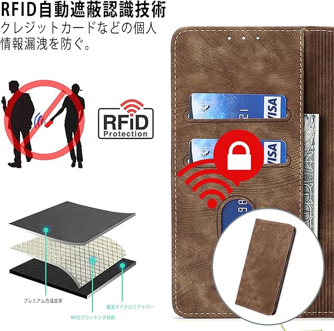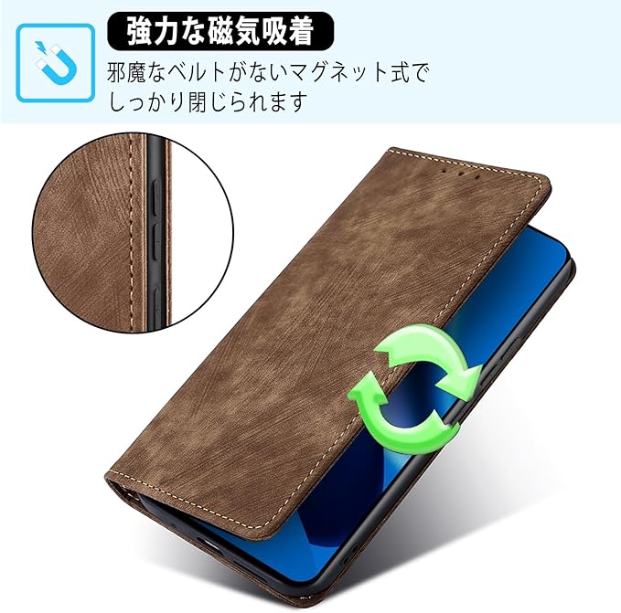 【素材】:NicMoolスマホケース手帳型外部は上質な合皮レザー素材を採用しており、傷や埃を防ぐことができます、滑りにくく、指紋、油分などもつきにくく。外部のPUレザー+内部の黒TPUという二重保護で、衝撃減少の機能性が抜群、スマホをしっかりと守ることができます。インナーケースは弾力性の柔軟黒TPU素材を採用しており、角までしっかり保護できるケースです、柔軟性があり本体への装着脱着も簡単です。注:磁気を帯びているため、ワイヤレス充電はお勧めしません。