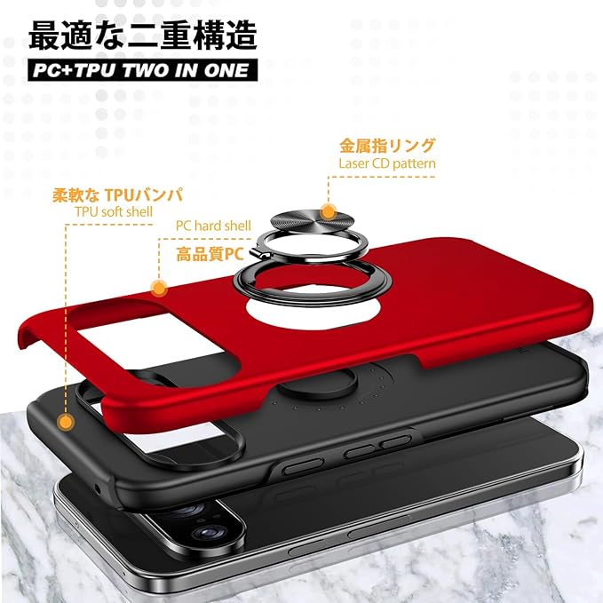 【リング付き・スタンド機能】後ろで嵌め込み式リング付き、伝統的なリングと比較して、アイフォーンの水平安定性を維持することができます。ケースを横向きにするとスタンド機能になり、360度回転と120度調節可能です。マグネット対応金属板採用し、車載ホルダーに強く吸着することもできます。
