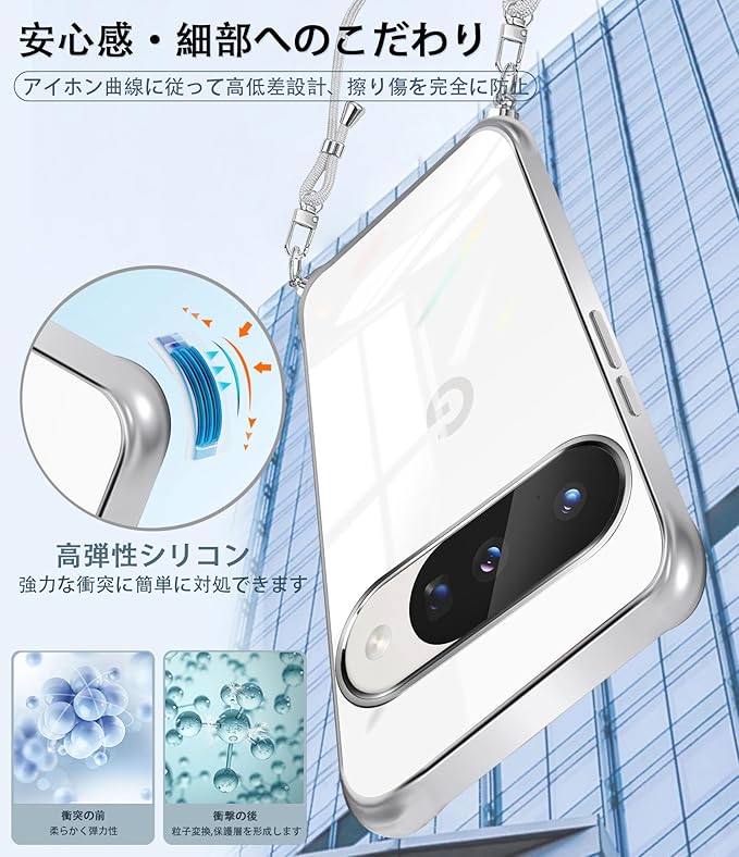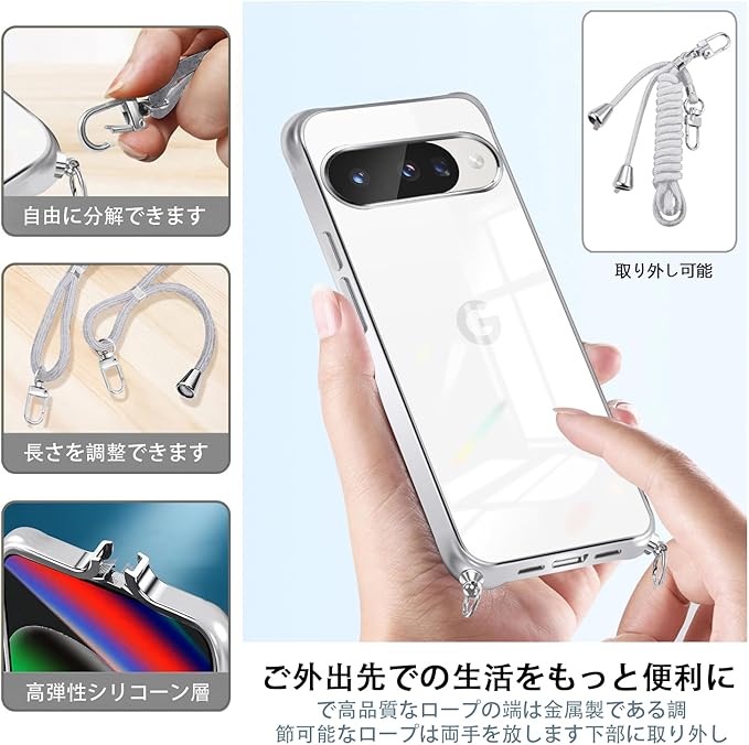 Google Pixel 10/10 Pro ケース 薄型カ 肩ひも ネックバンド 長さ調整可能 斜め掛け可能 TPU 耐衝撃 ピクセル10 インテリジェントシェル 傷つけ防止 衝撃吸収 ピクセル10 pro シリコンケース 軽量 薄い カメラレンズ保護 pixel10 落下防止 柔軟 黄変防止 カバー 米軍MIL規格 (シルバー)