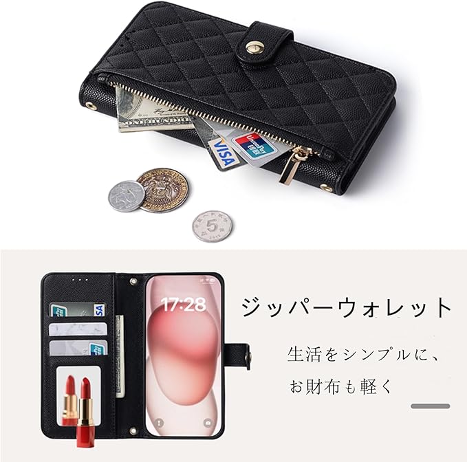 【外観と配色】:Google pixel 9 pro ケース には、リストストラップと斜めのショルダーストラップが付属しています。スマホをしっかりホールドでき、落としにくい。また、ショルダーストラップを斜め掛けにすることで、外出時に両手が空くので便利です。必要に応じて適切な長さを選ぶことができます。携帯ケースの表面には、手触りも質感も心のこもった刺繍加工が施されています。高級感のあるゴールドのメタルジッパーが、一味違ったファッションを演出します。また、豊富なカラーバリエーションで様々な選択肢に対応できます。