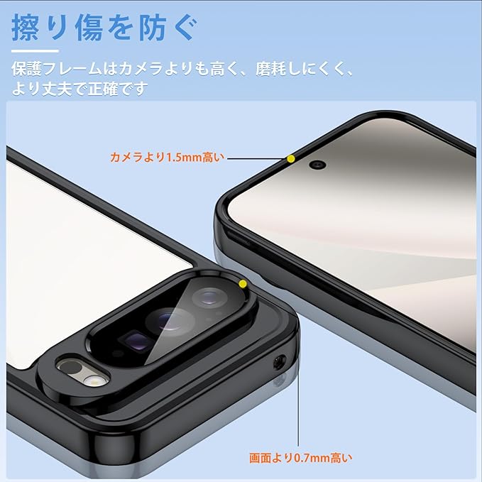 「耐衝撃性」ケース側面のTPU素材は弾力性と柔軟性に優れ、衝撃吸収性と耐衝撃性を兼ね備えています。あらゆる角度からしっかりと保護し、落下、衝撃、傷からスマートフォンを守ります。TPU素材は摩擦力を高め、滑りを防ぎます。スマートフォンを傷つける心配なく、簡単に着脱できます。