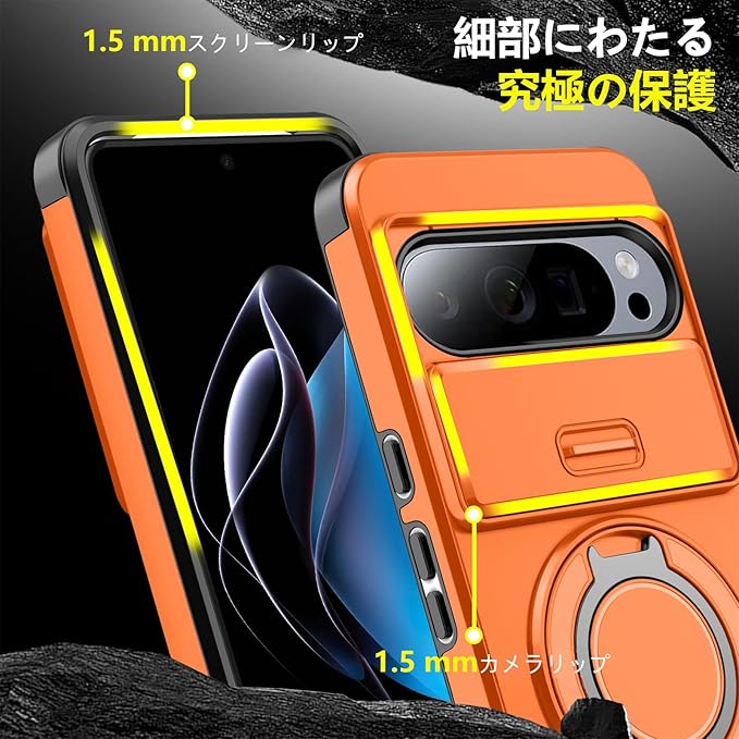 対応 Google Pixel 10 Pro XL 用 ケース スタンド付き リング付き 耐衝撃 レンズ保護 スライドカメラカバー TPU+PC 軽量 滑り止め 落下保護 スタンド機能 車載ホルダー対応 ピクセル 10 プロ XL 携帯ケース オレンジ R-LK-GP10PXL-06