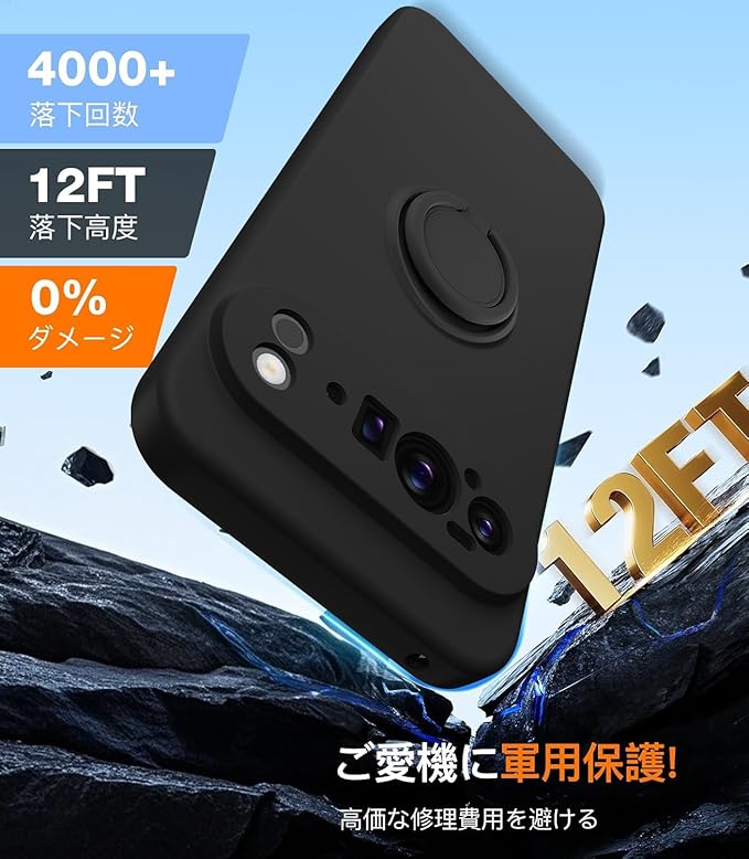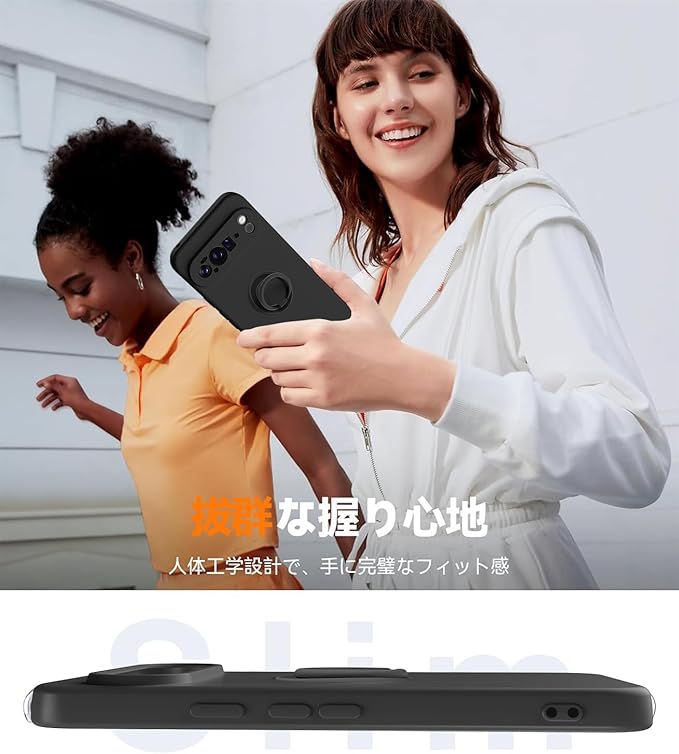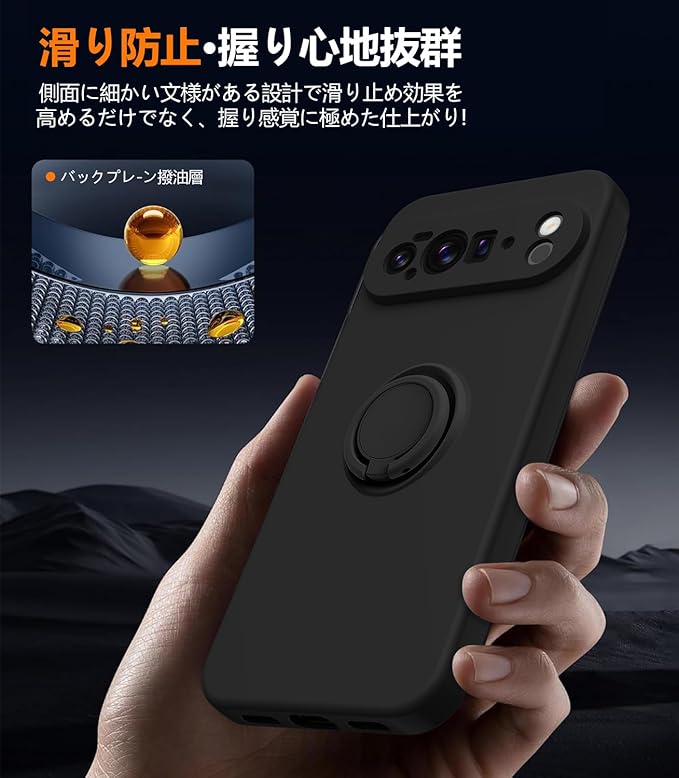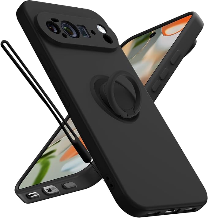対応 Google Pixel 10 Pro XL 用 ケース リング ストラップ付き ストラップホール付き ソフト シリコン おしゃれ 耐衝撃 軽量 薄型 スタンド機能 車載ホルダー対応 ピクセル 10 プロ XL 携帯カバー 黒 R-YTDS-GP10PXL-01