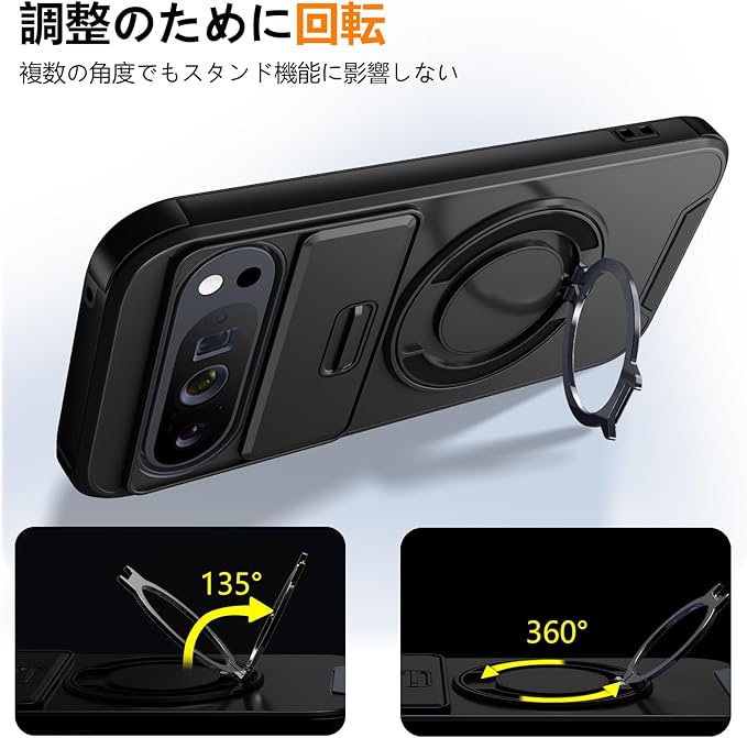 対応 Google Pixel 10 Pro XL 用 ケース リング付き スライド式カメラカバー 隠しスタンド 耐衝撃 スタンド機能 縦横両対応 車載ホルダー PC TPUバンパー 防塵 人気 落下防止 滑り止め 指紋防止 ピクセル 10 プロ XL カバー 黒 MJJ-1065-10-01-CP