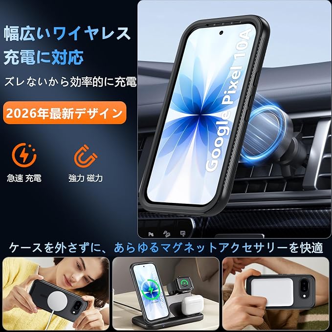 【MagSafe 対応・吸着充電】家・車で便利な充電体験。Google Pixel 10a ケース は強力なマグネットを内蔵し、MagSafe 充電器に近づけるだけでピタリ吸着します。ケースを外す手間が省け、寝る前のベッドサイド充電や、車でのナビ中の車載充電もスムーズに行えます。磁吸部分のゴミを定期的に掃除することで、長期間安定した充電体験を維持できます。
