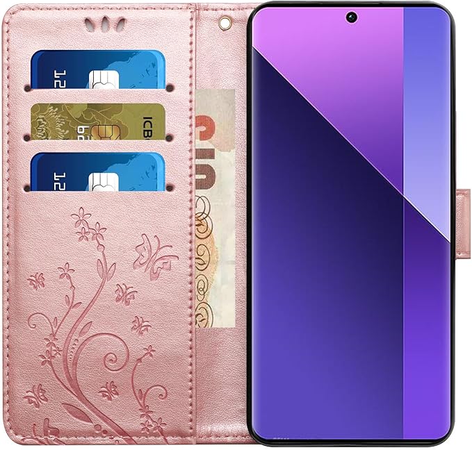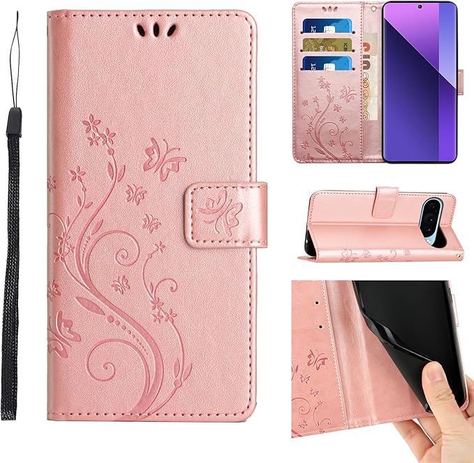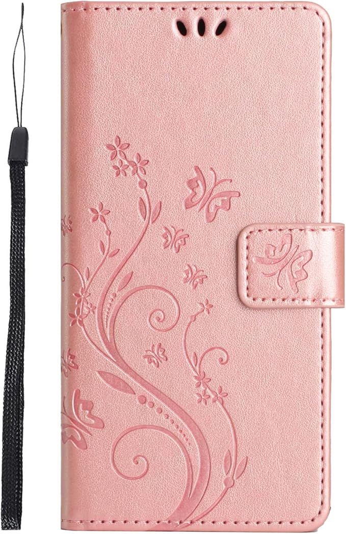 Lhyxuuk for Google Pixel 10 / Pixel 10 Pro対応ケース 手帳型おしゃれ 純色 エングレーブ草花と蝶の仕上がり横開き PUレザーケース ストラップ付き カードポケット付き オシャレ蝶柄 スタンド耐衝撃 ピクセル10 / Pixel 10 Pro用マートフォンカバー マグネット対応 装着やすい (1-ローズゴールド)