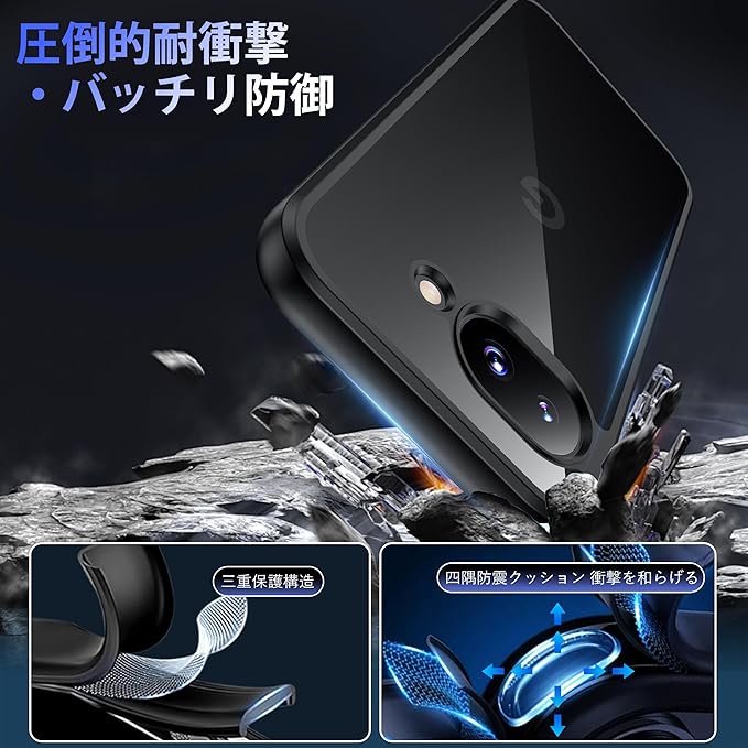 【全方位衝撃吸収・軍事レベル】 軍事規格の防護コンセプトを取り入れ、360度の保護を追求。「硬質背面+弾力性TPUフレーム」の複合構造:背面の強化アクリル素材が日常の摩擦から守り、四隅と側面の柔軟TPUが落下時の衝撃を効果的に吸収・分散します。画面やレンズの脆弱性に特に注目し、エッジはわずかに高くなったデザインを採用し、天然のバリアになり、平面に置いた時の擦り傷を防ぎます。