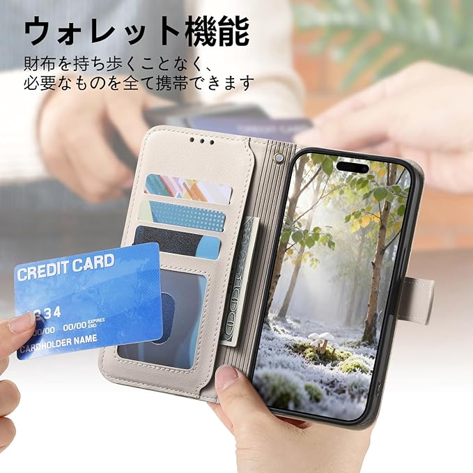 便利な収納:ケース後ろにはカード入れが3つと1つ現金ポケットがあり、ユーザー様はカードや学生証、運転免許証、紙幣などを入れることができるので、外出時にバッグを忘れる手間が省け、日常のお出かけに最適です。ハウジングの側面にはマグネットが内蔵されており、フリップカバーはとても便利です。カード表面に直接触れることがないため、磁気カードの破損を心配する必要がありません。