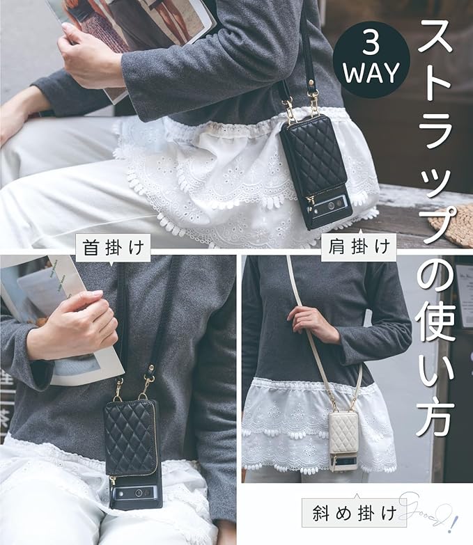 【背面手帳型 ショルダー ケース・スタンド機能】 スッキリした背面手帳型 スマホケース。携帯の表はおおわず、カード 収納は裏面に。スマホの画面にすぐタッチ。使うたびに開くわずらわしさがない! フリップ部分にしっかり厚みがあるので、開いて立てるとスマホスタンドとして使える。かんたんにスマホを支えて、映像やビデオ通話などに楽しめることができる。使わない時はスマートに収めるから邪魔にならない。( tip:ファスナー位置の調整によりスタンドの安定性を高める)スマホケース ピクセル ケース