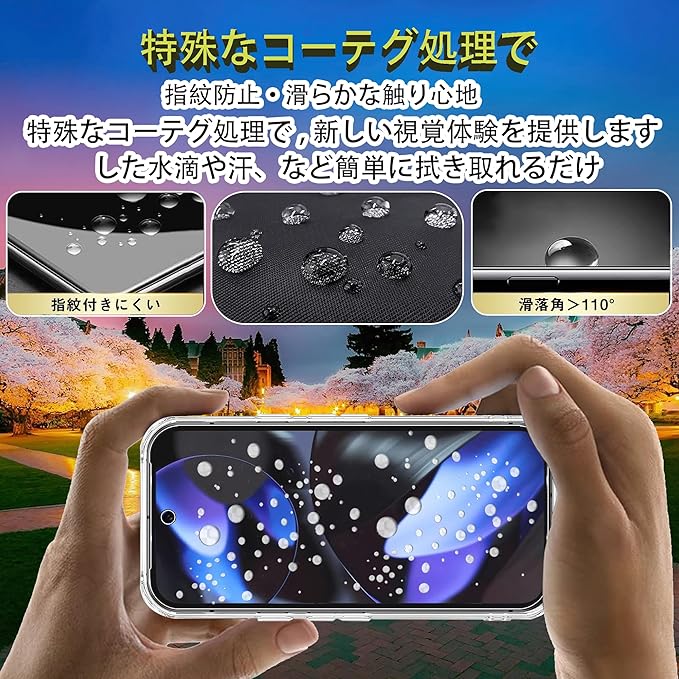 【指紋防止】保護フィルムには疎油性コーティングが施されているので、スマホ表面には指紋が付きにくくなり、清潔でクリアな状態を維持できます。油弾く効果が優れて、水滴が球状に保たれます。光の透過率が99%で、透明度が普通の ガラスよりも高くて、元々の画質が損なわれません