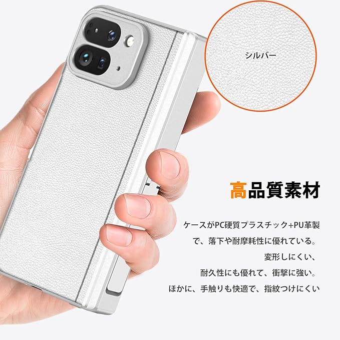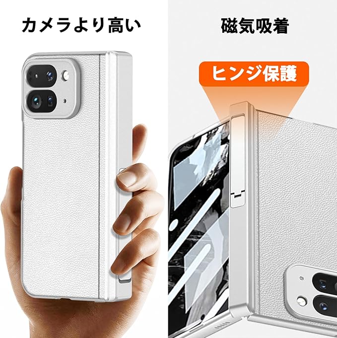 NINKI適応 Google Pixel 9 Pro Fold ケース スタンド機能付き 磁気吸着ヒンジ 折り畳み式 PC+レザー素材 スクリーンフィルム一体型 ヒンジ保護 衝撃吸収 ワイヤレス充電 グーグル ピクセル 9プロ フォールド カバー(シルバー)