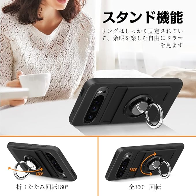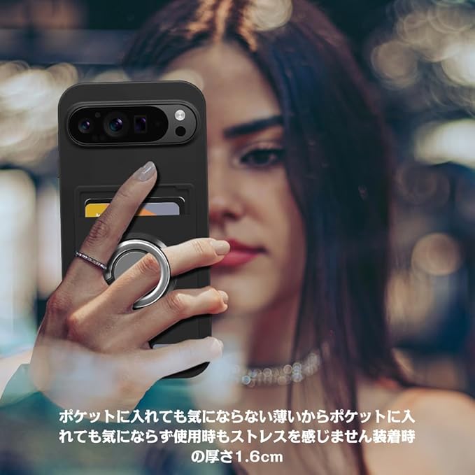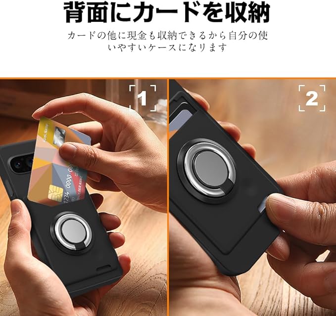 For Google Pixel 9 / Google Pixel 9 Pro ケース リング付き シリコン カード収納 グーグルピクセル9/9 Pro スマホケース スタンド機能 360 回転リング 耐久 滑り止め 黑