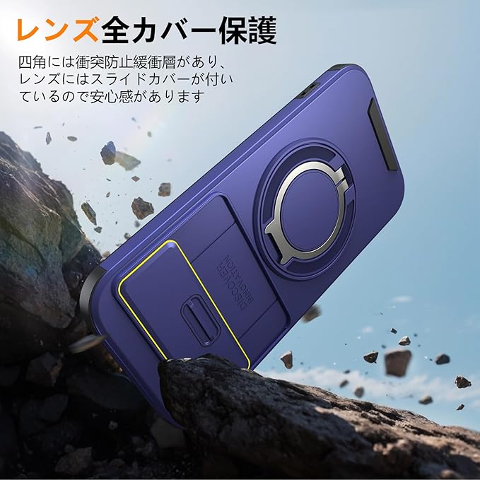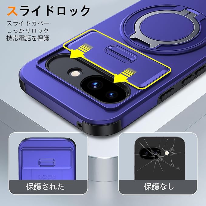 対応 Google Pixel 10A 用の ケース リング付き スライド式カメラカバー 隠しスタンド 耐衝撃 スタンド機能 縦横両対応 車載ホルダー PC TPUバンパー 防塵 人気 落下防止 滑り止め 指紋防止 ピクセル 10a 用のカバー 青 MJJ-1065-19-02