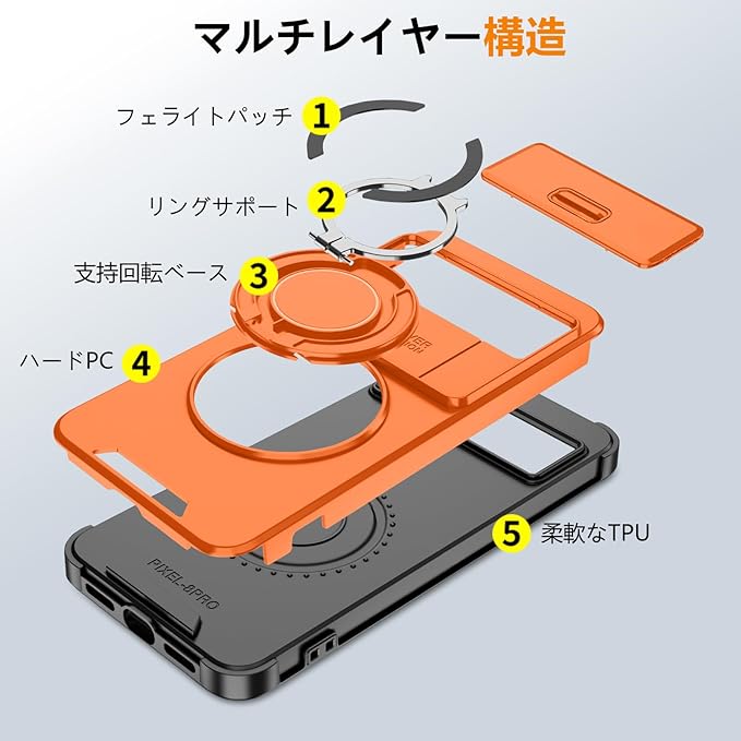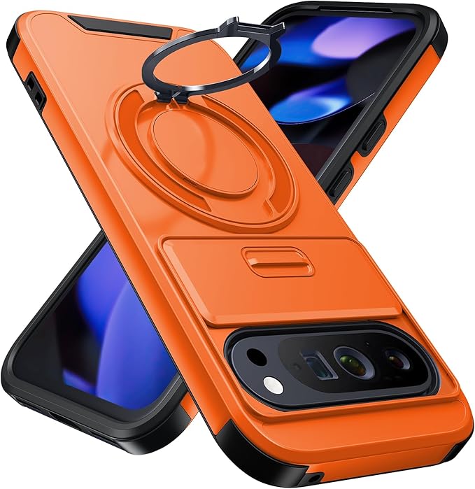 Google Pixel 9 用 ケース リング付き スライド式カメラカバー 隠しスタンド Google Pixel 9 Pro 用 ケース 耐衝撃 スタンド機能 縦横両対応 車載ホルダー PC TPUバンパー 防塵 人気 落下防止 滑り止め 指紋防止 ピクセル 9/ピクセル 9 Pro カバー オレンジ MJJ-1065-05-06