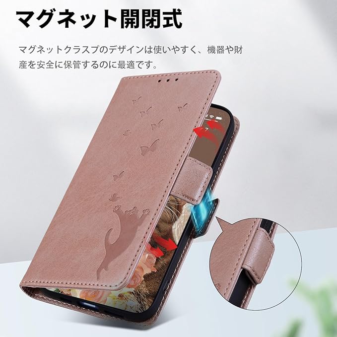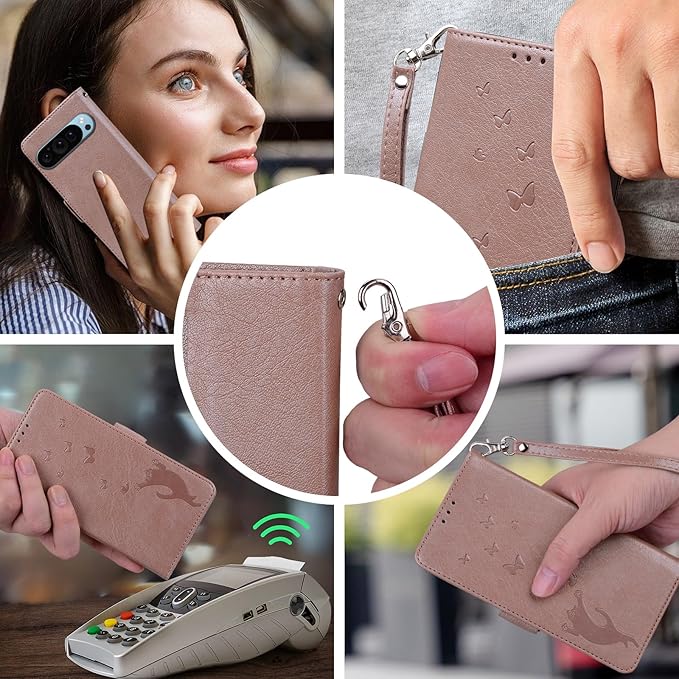 for google pixel 9 pro xl ケース 手帳型 グーグルピクセル9プロxl ケース ピクセル9pro xl ケース グーグルピクセル 9 pro xl スマホケース 手帳型 pixcel9pro xl ケース 人気 蝶と猫の3Dパターン スタンド キャッシュポーチ リストストラップ プレミアム耐久性PUレザー 磁気吸引 リストストラップ[ローズゴールド]