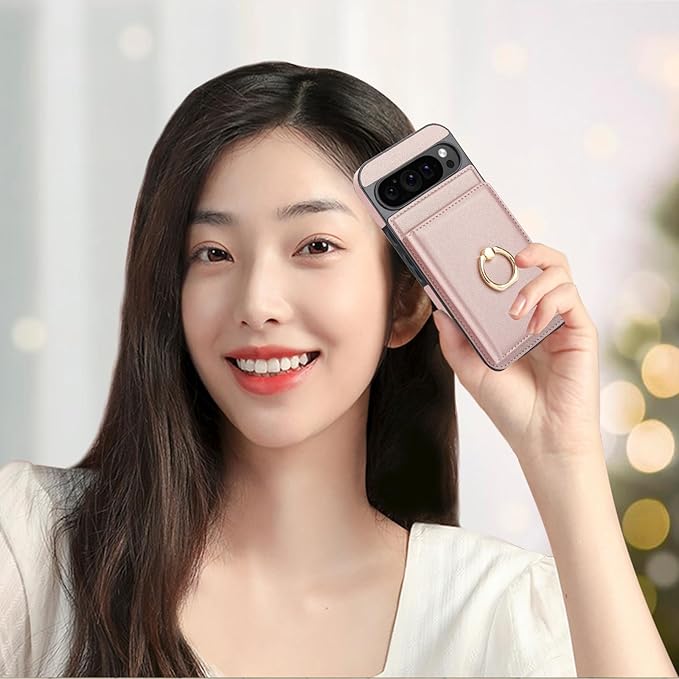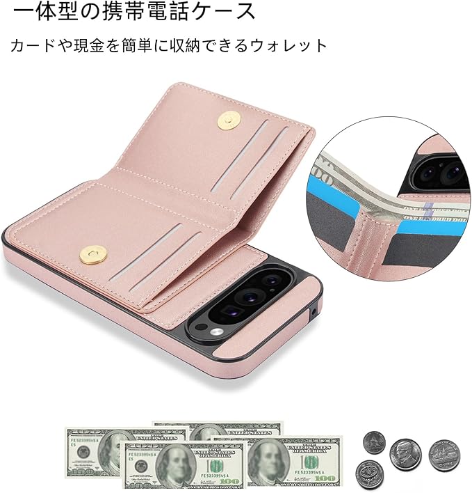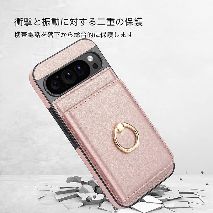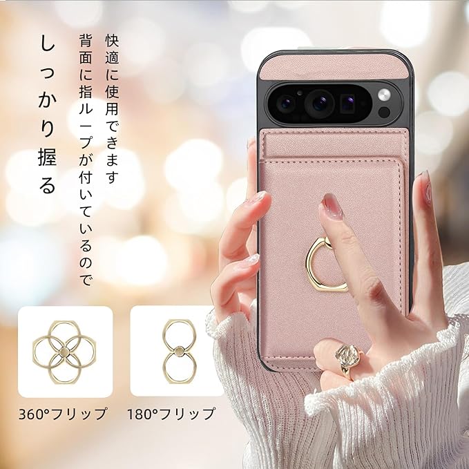 Pixel9 Pro XL ケース 手帳型 グーグル ピクセル 9 プロ XL 用 カバー ピクセル9Pro XLカバー 一体型リング付き 背面 PUレザーケース スタンド機能 カード収納 シンプル おしゃれ 耐衝撃 RFIDブロック機能 対応 Google Pixel 9 PRO XL カバー TPU 保護ケース カバー背面 - ゴールデンピンク