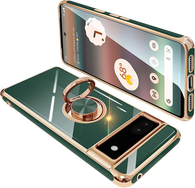 に適合するGoogle Pixel6A 用のケース リング付き グーグル ピクセル 6A 用のリング カバー 耐衝撃 TPU メッキ加工 360 回転 スタンド機能 車載ホルダー ストラップホール付き(ダークグリーン)