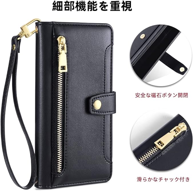【実用性】①:収納力抜群 カード収納が沢山あります。ファスナー式の小銭入れ、窓口式のカード入れ、カードスロット複数付き、それにピタッと閉じるマグネット式の留め具とスナップ式のプリップにより、大事なカードたちを完全に保護します。銀行カード、交通カード、ICカードなどのカード類、名刺、定期券、小銭などを入れて収納でき、ケースと財布一体型の大収納のデザインで、ちょっとした買い物や散歩に出かけるときは、このスマホケースを持っていけば十分です。②二種類のストラップ付き:▶肩掛けのストラップ 肩掛けのストラップの長さが調整しやすいのです、特にポケットがない服が多いのでストラップ付きなのがとても便利です。お出かけ時はショルダーに、家でゴロゴロする時はご自由に外します。▶ハンドストラップ ハンドストラップを自由に上下ストラップ穴を付ければ、いつでも落下防止できます。