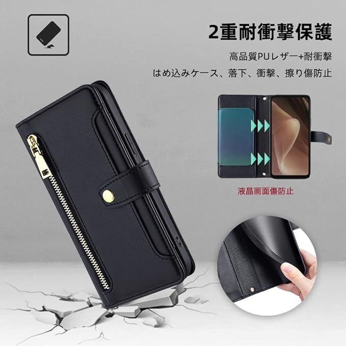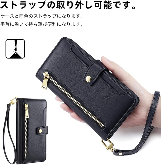 for Pixel 10A ケース 手帳型 ショルダー FOR グーグル ピクセル10A 斜めがけ 手帳 ケース【 ストラップ 長+短 2本】携帯カバー お財布付 肩がけ 首掛け ファスナー型 長さ調整可能 小銭入れ カード収納 スタンド機能 マグネット式 PUレザー ブラック