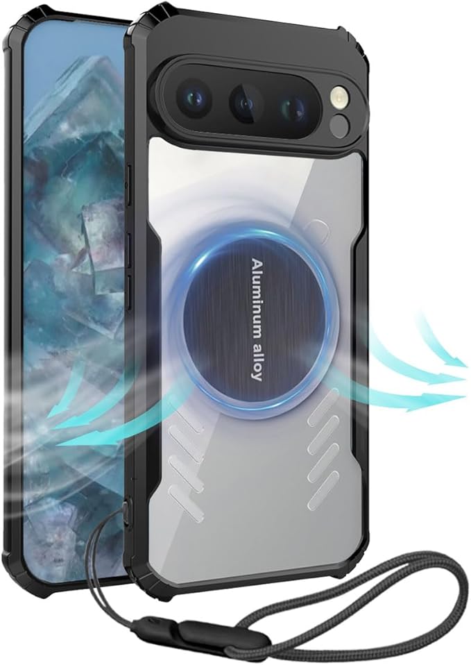 保護カバー for Google Pixel 9 Pro XL ケース ゲーム冷却/サポートカー磁気吸引/強化されたコーナー グラフェン冷却保護カバー 高耐久性 耐衝撃 TPU+アクリル質感 黄ばみにくい アジャスタブル・ランヤード付(ブラック)