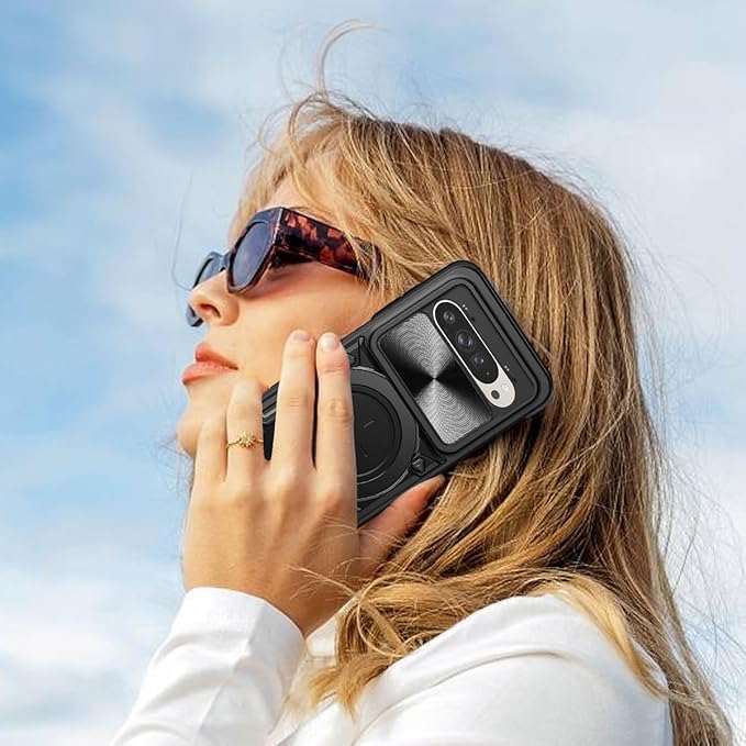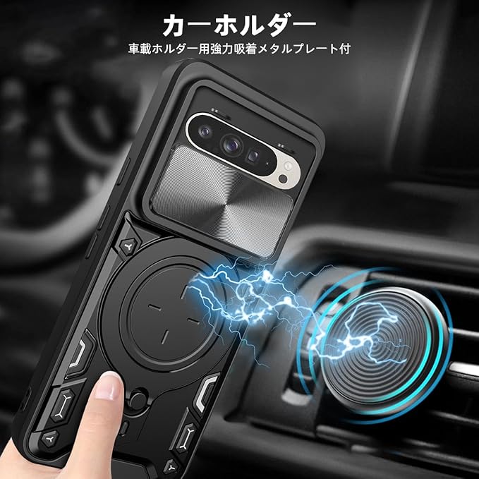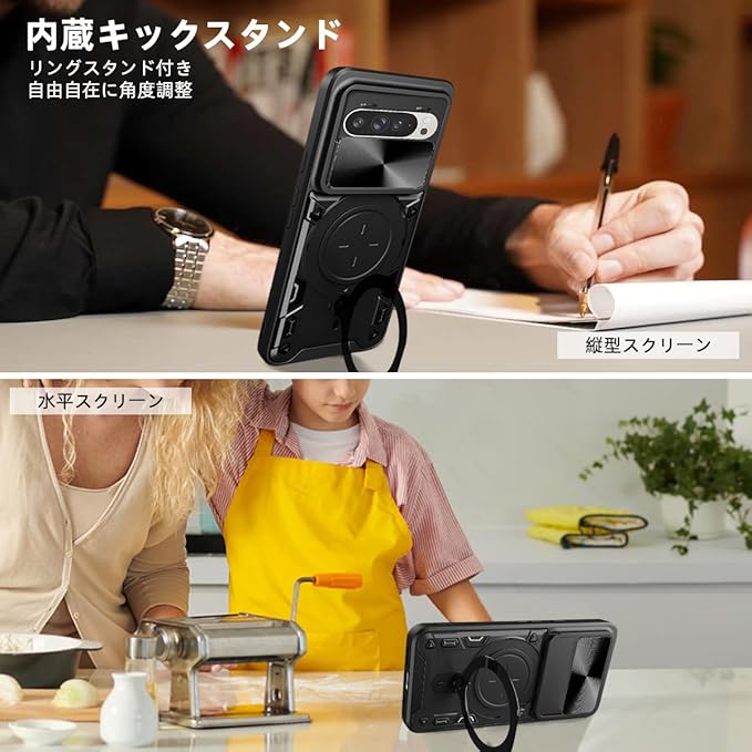 Google Pixel 9/Pixel 9 Pro 用 ケース+360 回転リング 隠し収納式 多機能一体 スタンド付き 携帯ケース 米軍MIL規格取得 耐衝撃 吸収 Case Cover ピクセル9/ピクセル9Pro 背面 カバー レディース メンズ(ブラック)
